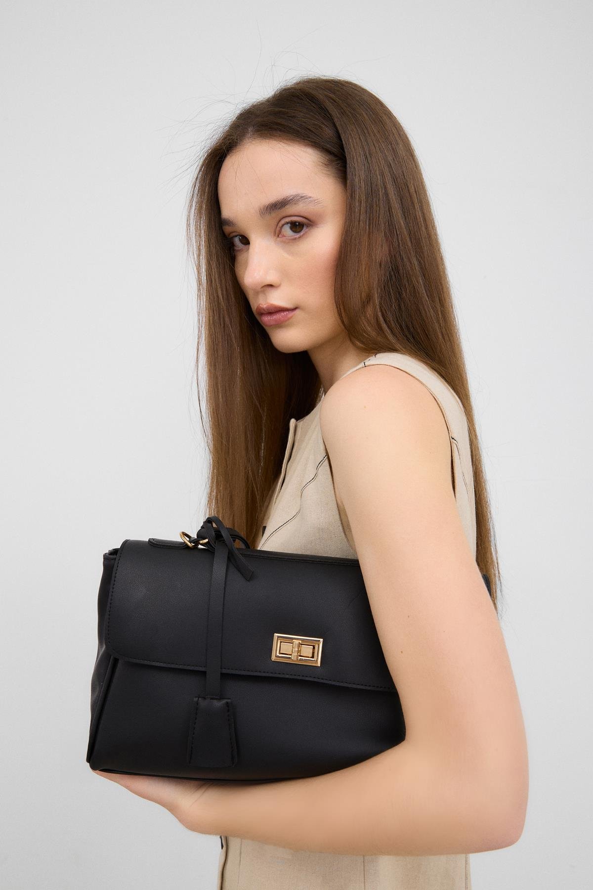 Amara Kilitli Klasik Omuz Çantası Krem Amara Kilitli Klasik Omuz Çantası Kahverengi Amara Kilitli Klasik Omuz Çantası Siyah